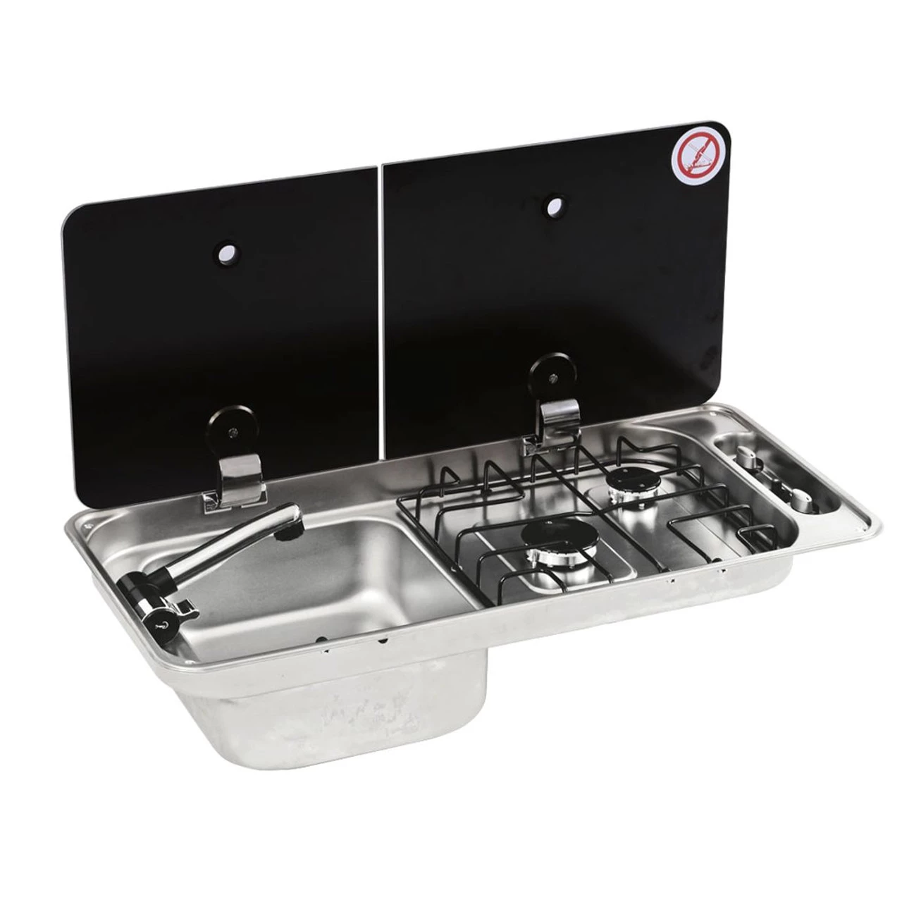 This rectangular hob and sink from CAN’s Randi range features twin gas burners, twin glass lids and stainless steel construction. The glass lids allow you to expand your worktop space when not using either the hobs or the sink, and feature concealed soft-close hinges, ideal for campervans, caravans, motorhomes and boats.